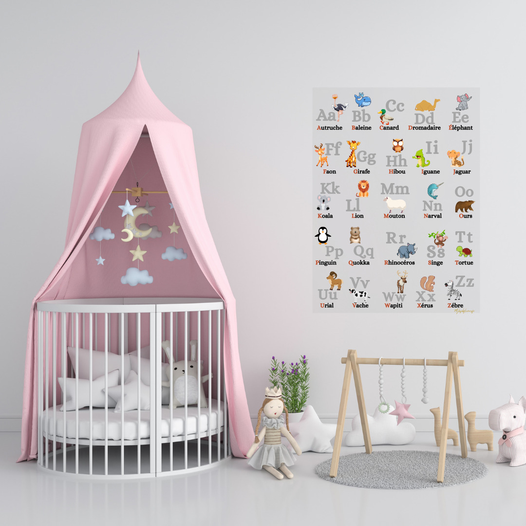 Tableau Alphabet en Plexiglass –  Facilitez l’apprentissage de l’alphabet avec ce tableau en plexiglass effaçable ! Chaque lettre est accompagnée d’un animal pour aider votre enfant à associer et mémoriser les sons. Il peut écrire et effacer facilement à l’aide de feutres adaptés, pour des sessions d’apprentissage ludiques et répétées. Idéal pour la chambre ou la salle de jeux !