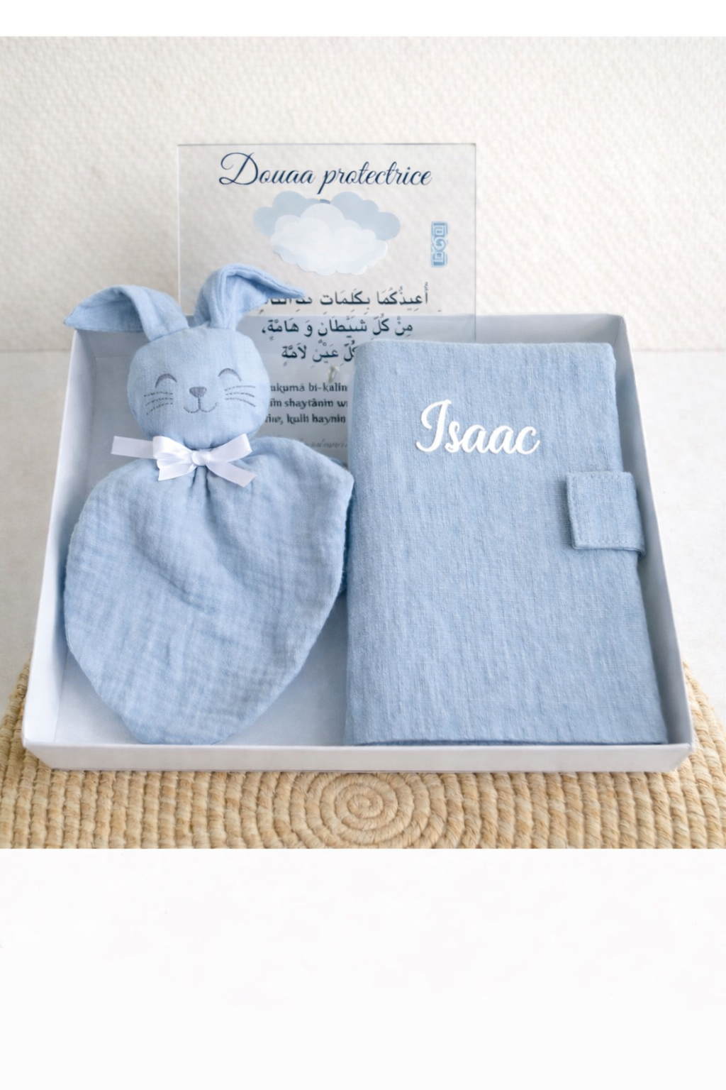 Le coffret comprend : – Peluche en gaze de cotton – Plexi Douaa protection enfant – Protège carnet de Santé en gaze de Cotton (en option)