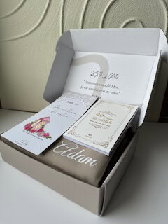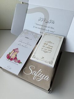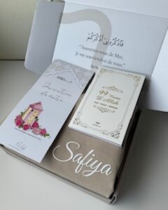 – 1 tapis de prière en velours – 1 livre 99 noms d’Allah – 1 carte invocations du matin